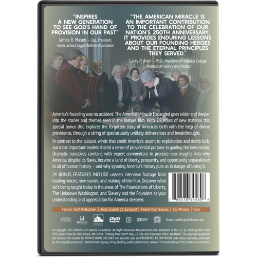 America’s founding was no accident. The American Miracle Expanded goes wider and deeper into the stories and themes seen in the feature film. With 2.5 hours of new material this special bonus disc explores the forgotten story of America’s birth with the help of divine providence, through a string of spectacularly unlikely deliverances and breakthroughs.